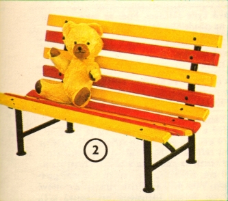 kostra kovová, latě dřevěné pestrobarevné. Výška sedu 33 cm, šíře lavice 100 cm. celý popis