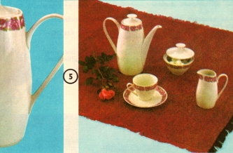 porcelánová, moderního tvaru, bohatě zdobená obtiskovým plastickým dekorem. Porcelán je bílé barvy. Pro 6 osob.
