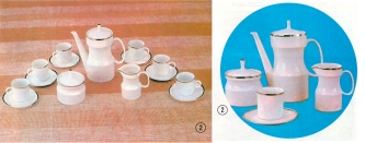 z jakostního porcelánu nového moderního tvaru, bílé barvy. Okraje jsou zdobeny platinovou páskou.