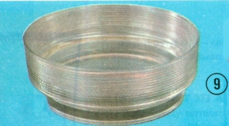 z lisovaného skla. Velká mísa a průměru 18,5 cm. 6 misek 10 cm.