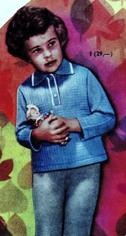 předškolního věku. Límeček a léga je zdobena bílým proužkem. Pulovr je pleten plastickým vzorem. Materiál — vlna.