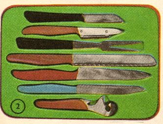 v kazetě z plastické hmoty ve složení: nůž na zeleninu 2,5", nůž NCH 6", nůž Karon 4,5", nůž kuchyňský 5", škrabka na brambory nožová, vidlička předkládací, otvírač Trion.