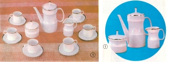kvalitní porcelánová souprava moderního tvaru, bílé barvy. Okraje jsou zdobeny platinovou páskou.