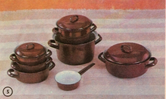 velmi trvanlivé smaltované. Mírně kónický tvar umožňuje zahřívání stěn, čímž se uspíší bod varu. Sestava: hrnec 1,5 l, 3 l a 5 l, rendlík 1, 2 a 3,5 l vč. pokličky, a malá pánvička.