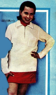 pro mládež do 16 let. Zapínání na předním díle je na kovový uzávěr. Ozdobu tvoří našitá kapsa. Materiál — vlněné froté.