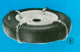 na osobní a dodávkové automobily. Upínají se tak, že se provléknou otvorem v disku kola, takže jejich montáž probíhá nesmírně rychle, bez obvyklého zvedání vozu. Souprava na 2 hnací kola sestává z 8 jednotlivých řetězů různé délky. 7článk. řetězy jsou určeny pro tyto typy vozů: MB 1000, Skoda Octavie, Felieie, Wartburg, Renault 4 GV, Renault R 8, Volkswagen, Opel Rekord, Ford Taunus, Fiat 1300, 1500, Simca 1000 a 1300. Jednotlivý řetěz sestává z určitého počtu článků, kožené zápinky a zápřesky. Váha 9článkového řetězu je 340 g. Dodáváme v soupravě po 8 kusech. V objednávce uvedce počet článků.
