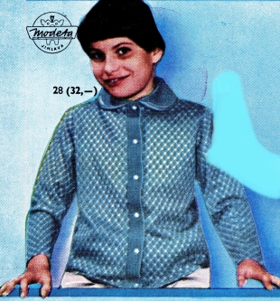 pletená krajkovou technikou. Zaoblený límec a léga je z pružného úpletu. Materiál je vlna, kombinovaná um. vláknem.