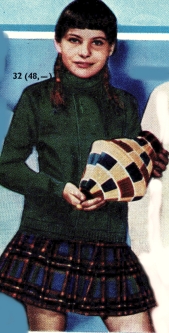 pro děti do 10 let. Středem předního dílu je ozdobně pletený pruh. Spodní okraj je ukončen pružným patentem. Materiál je um. vlákno a vlna.