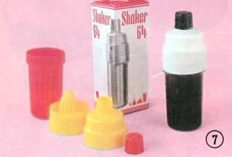 mísící džbán z umělé hmoty, k přípravě ovocných koktejlů. Uvnitř šejkru je lis na citróny.