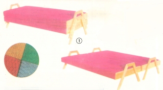 Jsou dvě válendy stejného rozměru 90x195 cm, vtipným způsobem zasunuté na sobě. Nadzvednutím za rám bočních stěn získáte dvě lůžka, která si libovolně sestavíte, buď jako rohové, nebo manželské dvoudílné lůžko. Váš byt může být každý den jiný. Výplň čalounění molitan. Dřevina světlý a mořený dub, barvy čalounění červená, fialová, šedá, zelená a žlutá. 1ks