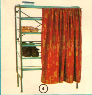 Vhodný doplněk do předsíní. Poličky se dají nastavovat na různou výšku a tím je umožněno ukládání všech druhů obuvi. Povrch syntetická barva. Botníky se dodávají bez závěsu, ve třech různých rozměrech. B 1 — výška 87 cm, šířka 72 cm, hloubka 33 cm, je na 15 párů obuvi.