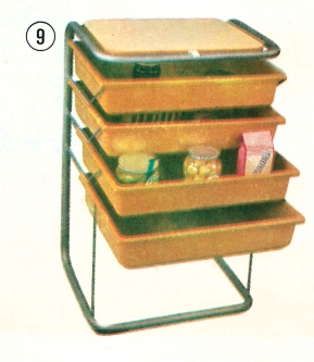 kostra kovová, zásuvky z novoduru. Vrchní deska upravená jako pracovní, polepená umakartem. Výborný pomocník pro domácnosti, závodní kuchyně a restaurace. Rozměr délka 43 cm, šířka 52 cm, výška 82 cm.