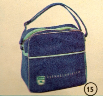 barva jasně modrá, zdobená bílým tiskem. Na přední straně s kapsou. Uzávěr na zip, držadlo prodlužovatelné. Dá se nosit přes rameno.