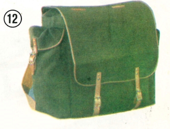 z pevného impregnovaného materiálu se dvěma postranními kapsami, nosné řemeny jsou kožené podšité plstí.