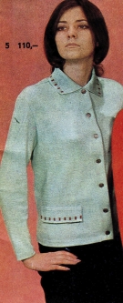 Límec a kapsy jsou zdobeny jemným vzorem. Na předním díle zapínání na kovové tepané knoflíčky. Materiál je vlna a umělé vlákno.